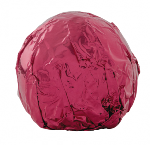 Raspberry truffle coated with dark chocolate and wrapped in fuchsia foil.